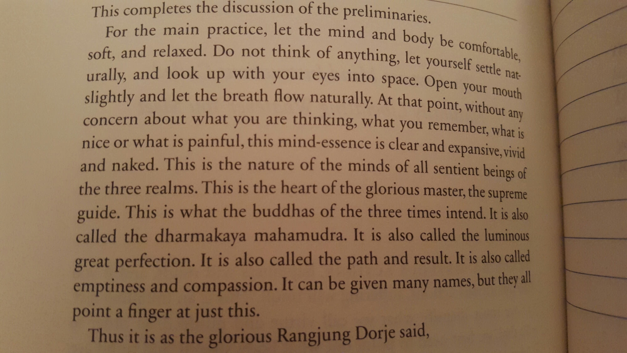 This is the heart of the highest Tibetan Buddhist teachings: to rest naturally and be vividly aware. Just be. I would add that in this no sense of self is being created, and this is the practice. To simply be, and not to take yourself as being a ‘self’ or ‘doer’. To use a commonly used phrase in vedanta: do not take yourself to be ‘this or that’.