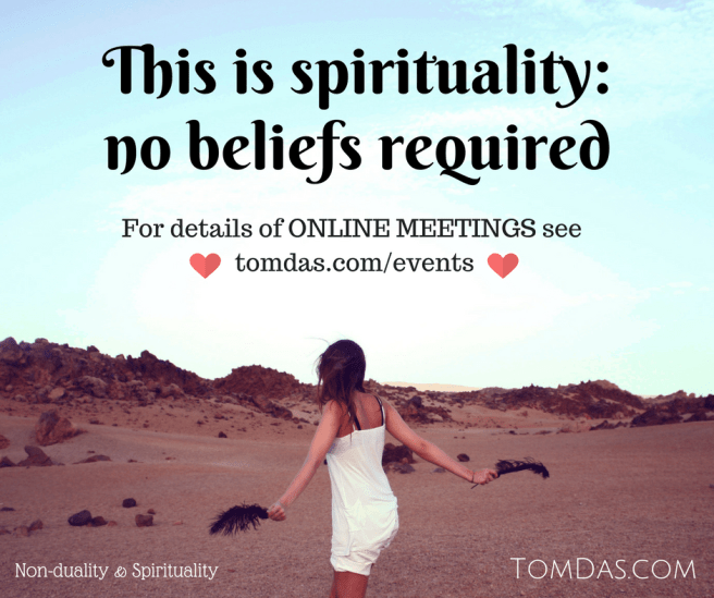 This is spirituality: no beliefs required May 3, 2017 ~ Tom Das Next ONLINE MEETING is Thursday at 8pm UK time. For details and how to join see http://meetu.ps/e/.gfjdwmywhbgb/1GbHK/d Share this: Click to share on X (Opens in new window) X Click to share on Facebook (Opens in new window) Facebook Click to share on Pinterest (Opens in new window) Pinterest Like Loading...
