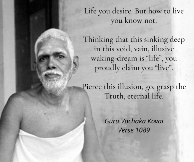 The Masters you mentioned, and others, each doubtless had – and has and continues to have always – his specific, special or unique role in man’s spiritual evolution, but the zenith spoken of by you will certainly not be reached by discussing the question, ‘How can all of these Mahanubhavars be right? On what points do they contradict themselves? Is it not our imminent task-on-hand to clear up these apparent contradictions and seeming mutual inconsistencies? Will that not endow us with special spiritual merit?’ Men waste entire lifetimes – fruitlessly – like this. This effort, if harnessed fully to keeping one’s Latchiyam [Tom: aim or target or goal] fixed entirely on Self or Reality, would have resulted in Mukthi long ago. Instead, countless lives have been frittered away on account of these wrong and foolish ideas about reaching Truth by using the Buddhi or the resoning faculty, when, in fact, precisely subsidence of that faculty results in revelation of Self or Reality. What a pity.