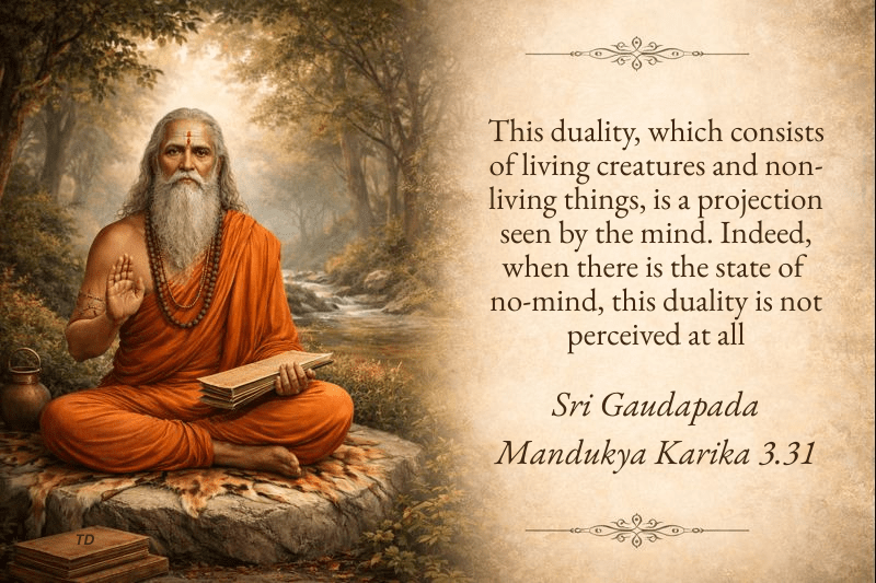 Gaudapada states that duality, which consists of all living and non-living things – ie. all objects – is merely a projection of the mind, and when the mind no longer exists (later it will be explained the mind no longer appears or exists in self-realisation), this duality is not experienced/perceived at all. Note how Guadapada specifically refers to and thereby defines duality as the objective realm of living and non-living things, and note how Gaudapada is clear there is no duality in non-duality. Shankara, in his commentary on this verse, states the following: