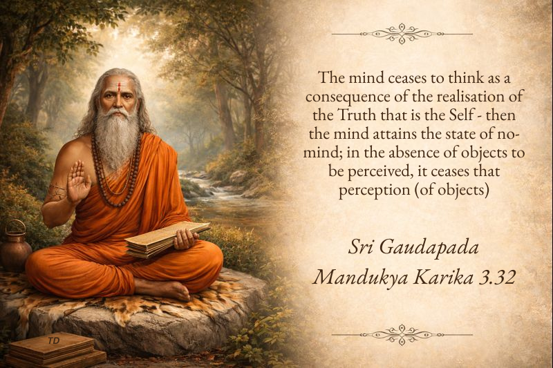 ‘The mind ceases to think as a consequence of the realisation of the Truth that is the Self (Atmasatya), then the mind attains the state of no-mind; in the absence of objects to be perceived, it ceases that perception (of objects).’