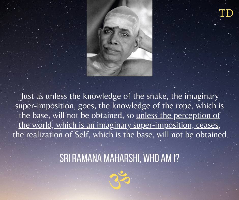 Just as the knowledge of the rope, which is the base, will not be obtained unless the knowledge of the snake, the superimposition, goes, so the realization of Self (swarupadarsanam), which is the base, will not be obtained unless the perception of the world (jagat-drishti) which is a superimposition, ceases.