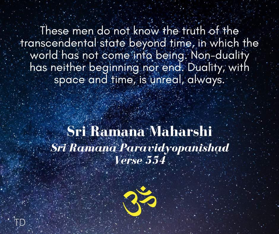 554. These men do not know the truth of the transcendental state beyond time, in which the world has not come into being. Non-duality has neither beginning nor end. Duality, with space and time, is unreal, always.